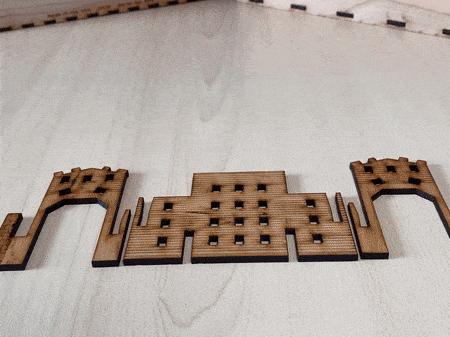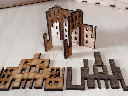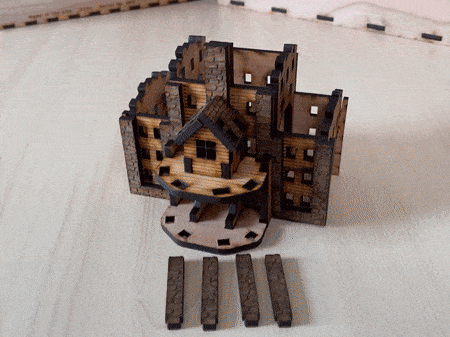 Slide each Large Side Wall onto the Rear Wall. Note that the rear wall does not have a central chimney, unlike the front wall. Use our video here to ensure you have the correct pieces and locations. Always make sure to face the engraved details towards the outside.