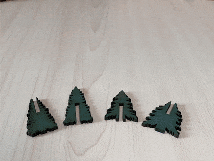 Slide the Large Tree Top piece onto the Large Tree Bottom piece. Then do the same with the small tree pieces. You will have six large trees and five small trees. Be gentle with the outer branches of the trees.